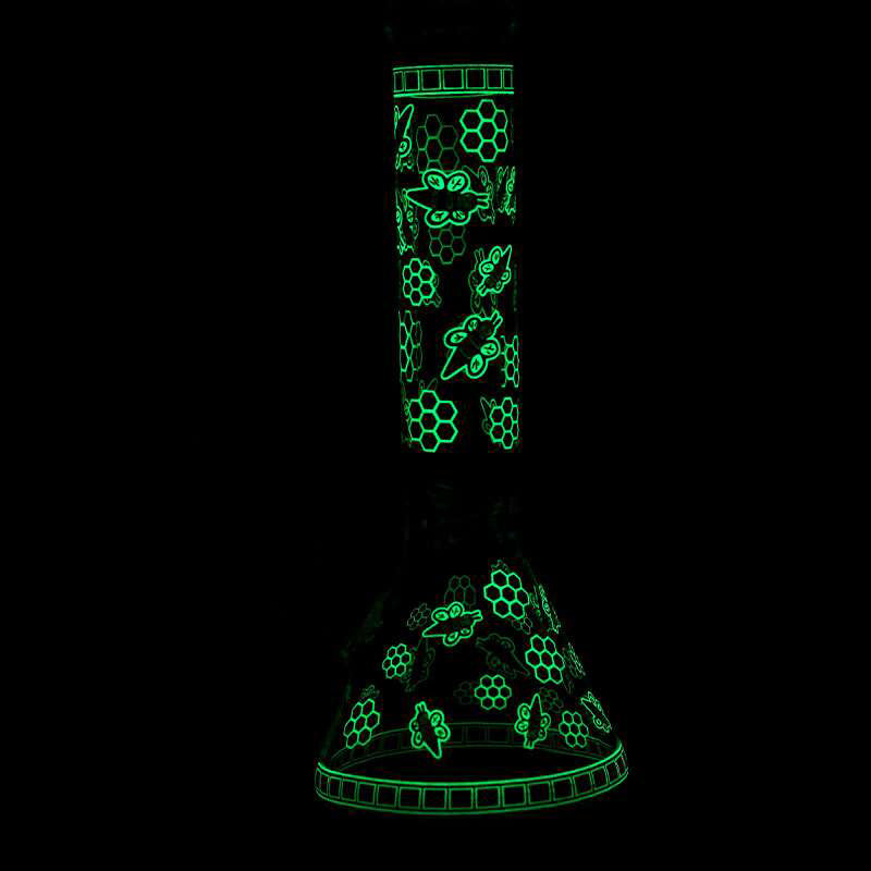 Bring a little buzz to your next session with the 14" Honey Bee Glow-in-the-Dark Beaker Bong. Crafted from premium 7mm borosilicate glass, this piece is built to last and delivers consistently smooth rips. The charming honey bee pattern glows in the dark, making it a standout in any collection.