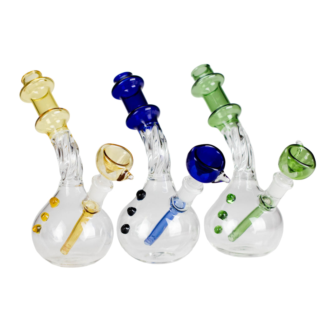 Compact, stylish, and functional, this 7-inch Twisted Bend Tube Glass Bong is designed with a unique bent neck and twisted detailing for both comfort and visual appeal. Its globe base provides stability while the angled design makes for smoother hits.