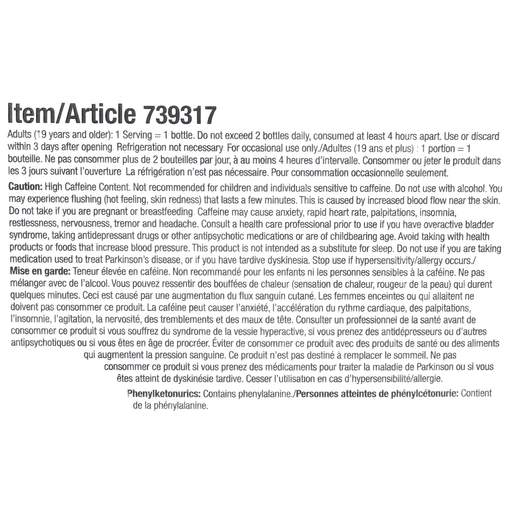 Mise en garde: Teneur élevée en caféine. Non recommandé pour les enfants ni les personnes sensibles à la cafeine. Ne pas melanger ave de l'alcool. Vous pouvez ressentir des bouffées de chaleur (sensation de chaleur, rougeur de la peau) qui durent quelques minutes. Ceci est cause par une augmentation du flux sanguin cutané. Les femmes enceintes ou qui allaitent ne doivent pas consommer ce produit. La caféine peut causer l'anxiété, 'accélération du rythme cardiaque, des palpitations,