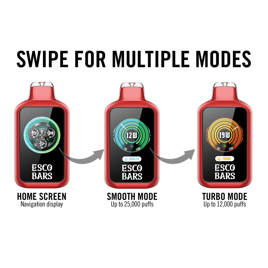 • Touchscreen Interface for easy control—adjust your settings effortlessly with just a swipe. • Smooth Mode (5-15W) and Turbo Mode (15-25W) – Choose between mellow, consistent hits for relaxed vaping or higher-powered sessions with larger clouds and intense flavor. • Lock and Unlock Feature to secure your screen, preventing accidental setting changes while in use or in your pocket. • Dual Mesh Coil Design for enhanced vapor production and flavor intensity. • Soft Tip for Comfort, offering a smooth, natural feel with each puff. • Puff Duration Display shows how long you've been vaping with each inhale, letting you track your usage. • Variable Wattage (5W to 25W) for customizable power, giving you the ability to fine-tune your vaping experience. • Adjustable Airflow for optimal control over vapor density and smoothness. • Powered by a 650mAh Rechargeable Battery that lasts longer, ensuring consistent power output. • 20mL of Pre-filled E-liquid with a 2% (20mg/mL) nicotine strength, giving you a smooth hit every time.