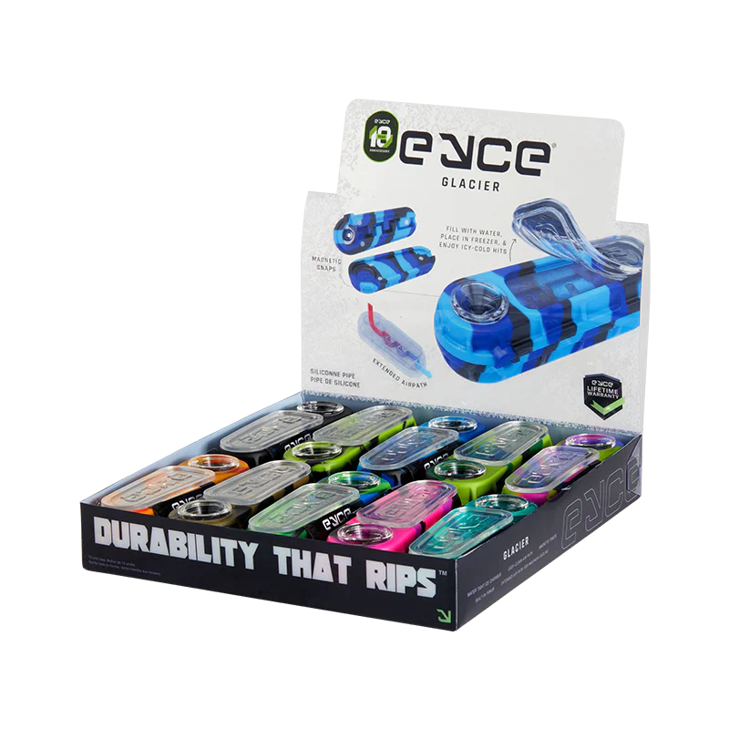 The Eyce Glacier is a tribute to Eyce’s roots in celebration of the brand’s 10th anniversary. Using ice to cool the smoke, the Eyce Glacier produces a refreshingly smooth rip. Under the optically clear lid, a water chamber that can be frozen creates cooled surfaces that smoke zig-zags its way through. With a split two-part design, the pipe is easily disassembled for cleaning and reassembled again for use. Featuring Eyce’s standard snap-in glass bowl and stainless-steel poker, the pipe features six magnets that are used to create a tight connection between the two halves.