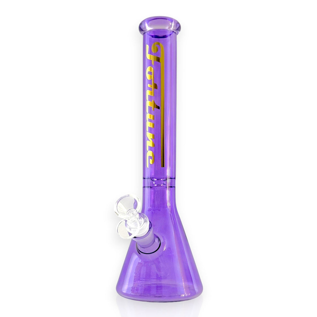 Introducing the Fortune Prism Series, a vibrant lineup of 12-inch beaker bongs crafted from 5mm thick borosilicate glass for dependable daily use. Featuring a sleek 38mm tube diameter, each piece delivers smooth, consistent airflow in a compact, easy-handling form. The bold, reflective gold Fortune logo adds a touch of luxury, while the classic beaker base ensures stability and ample water filtration. Available in six standout colors—grey, red, pink, purple, blue, and green—this collection brings both personality and performance to any smoking setup.