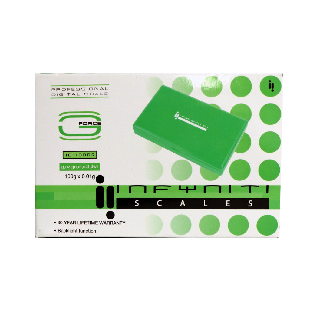 The Infyniti G-Force IG-100 mini digital scale maintains the high quality of the Infyniti brand with that extra bit of style. Feel like a G with these high quality digital pocket scales.