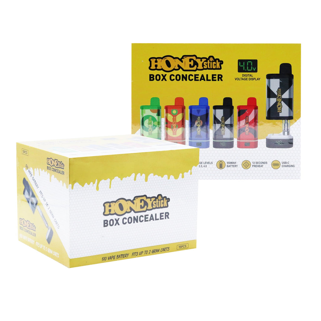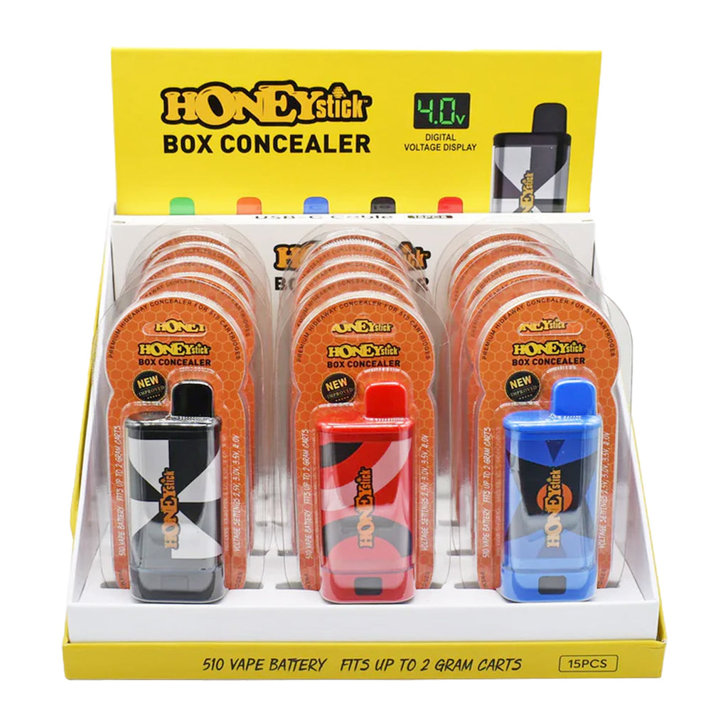 Introducing the Box Concealer Cartridge Battery, the latest addition to HoneyStick's 510 thread battery collection, designed with the needs of dispensaries and head shops in mind. This innovative device brings style, performance, and convenience to adult consumers' vaping experiences. This new Box Concealer Cartridge Batteries are available in a display of 15 assorted colors.