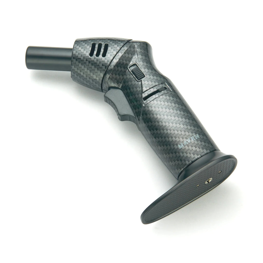The Maven Tower is a refillable torch lighter with a unique adjustable angle design, sleek form, remarkable quality and a powerful jet flame. The Tower is easily distinctive as it stands at 8 inches tall and carries an adjustable angle that can be rotated clockwise as desired. This key feature makes it a perfect cooking torch for any chef.