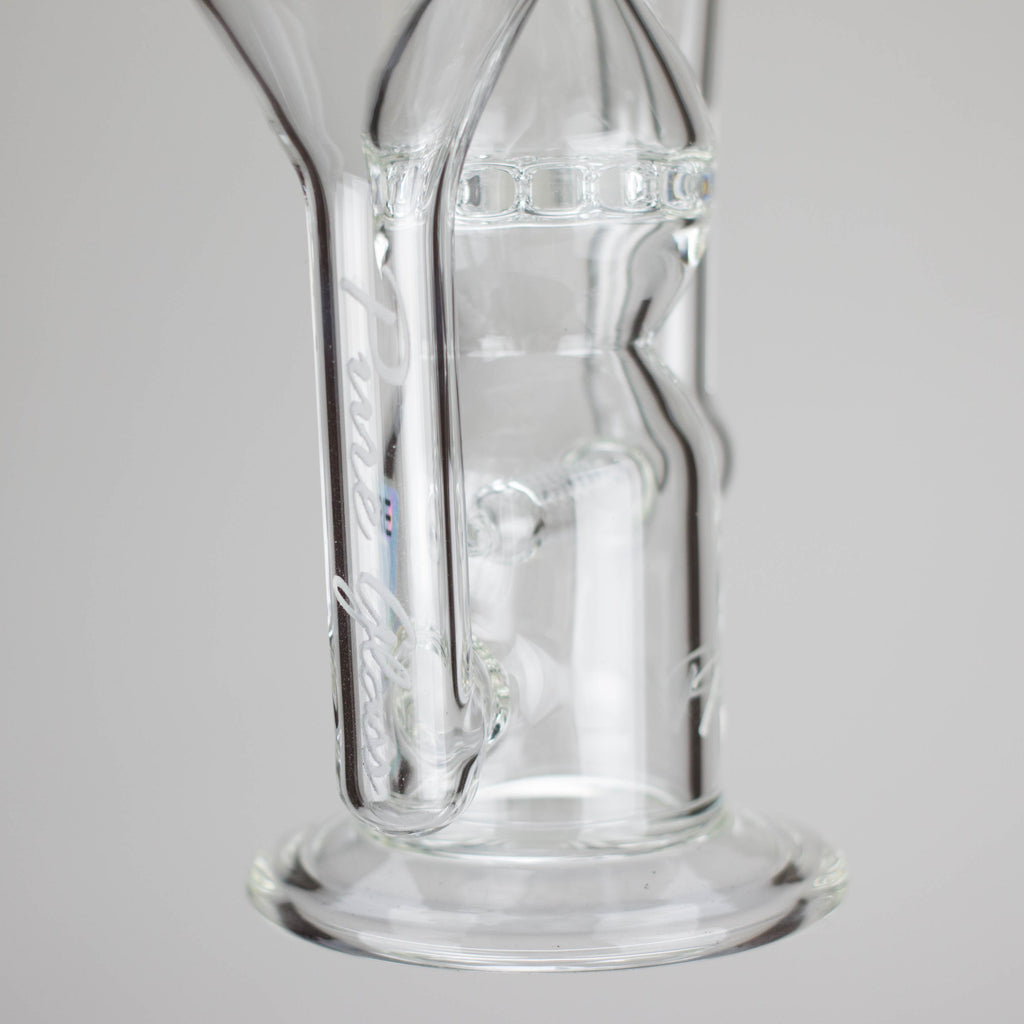 The Pure Glass Infinity Recycler 1 is a premium 12" bong designed for both flowers and dabs. Featuring an inline perc and a recycler design, it ensures smooth and efficient filtration for a clean, enjoyable hit. This piece includes a 14mm Female Bowl for flowers and a 14mm Female Glass Dome for dabs. The "Pure Glass" logo is elegantly deeply etched into the clear glass, adding to its refined aesthetic.