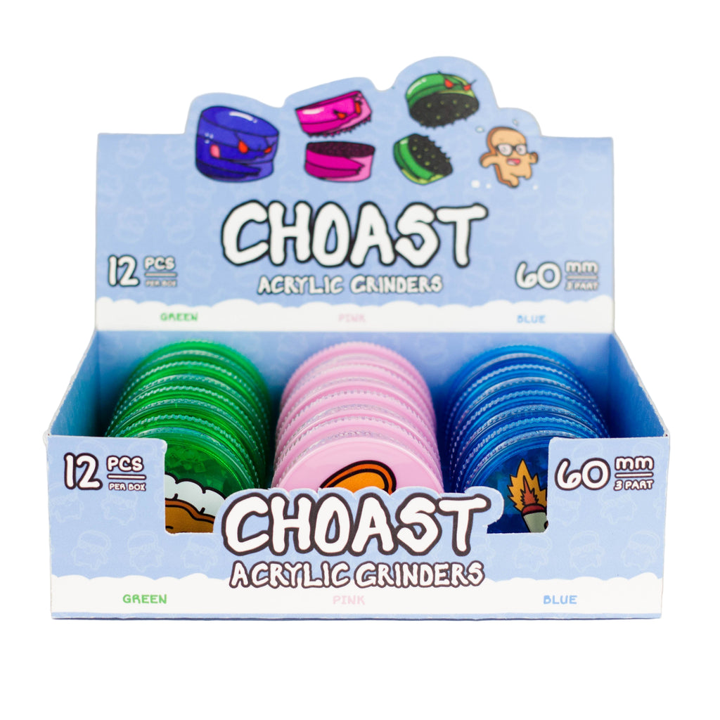 Boost your retail sales with the Choast 12 Pack Acrylic Grinder Display, featuring 12 durable and lightweight 3-piece grinders. Each grinder is crafted with sharp grinding teeth, a storage chamber, and a kief catcher for smooth, consistent performance.
