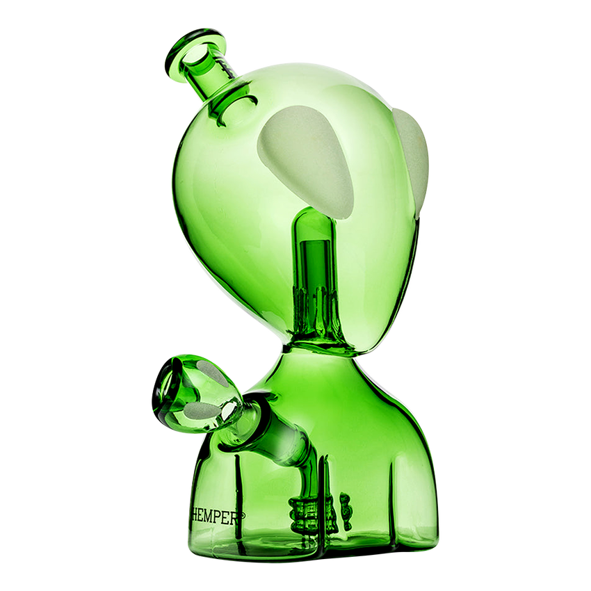 We come in peace--and we need to borrow a lighter! TheseAlien Glass Water PipesfromHemperare crafted in the shape of a surreal green alien with large, glow in the dark eyes. Available in two sizes, the Extra Large size sports a matrix percolatoranda UFO peroclator, while the Standard size is equipped with a fixed downstem. Standard pipe measures 6.5 inches (16.5cm) tall, and Extra Large pipe measures 8.5 inches (21.6cm) tall. Includes a 14mm male herb slide.