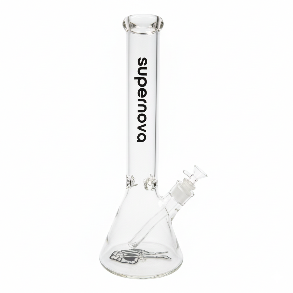 The Supernova 15" Beaker Glass Bong is a durable and sleek mid-size bong made from quality glass. Featuring assorted base decals, it delivers smooth hits and is easy to clean. A great choice for home sessions or as an attractive display piece in any smoke shop.