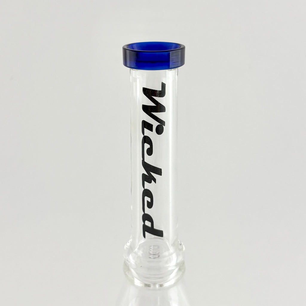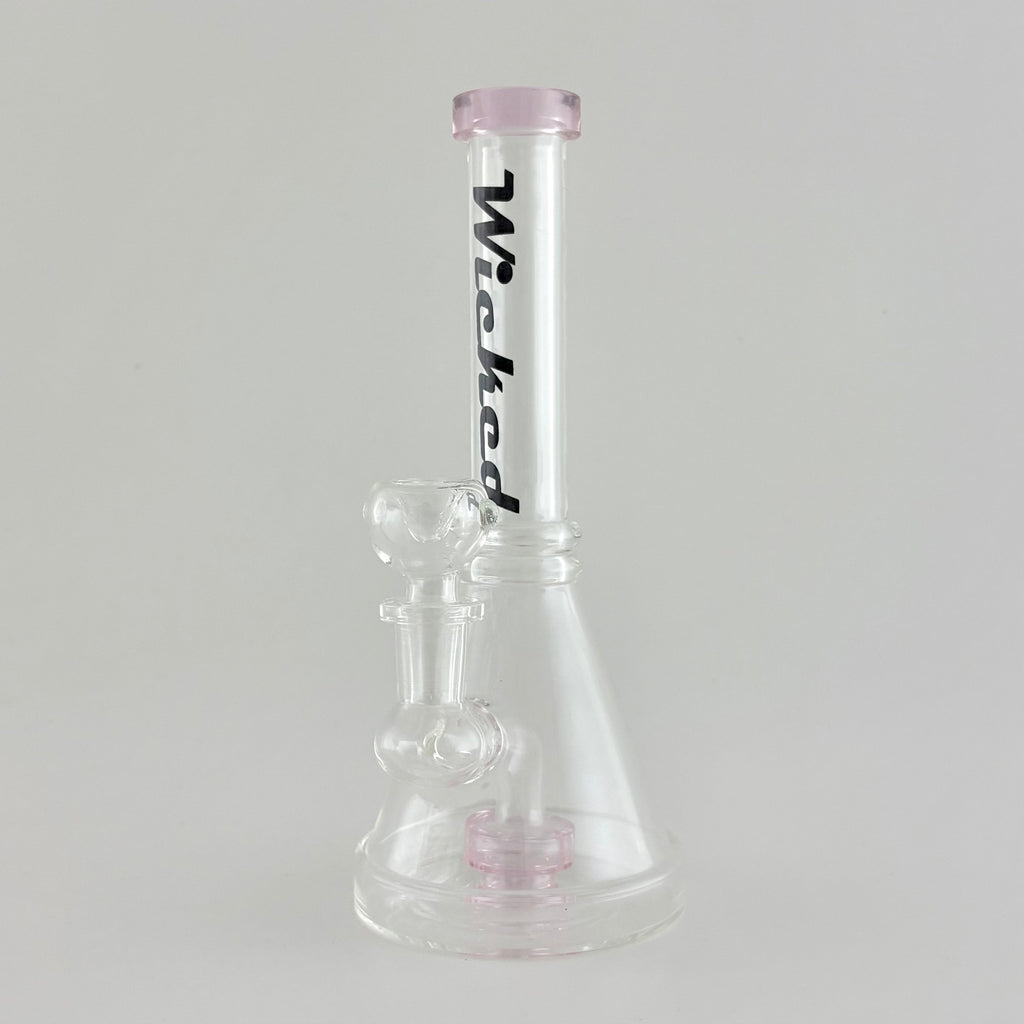 The design includes sleek straight neck tubing with bold “Wicked” branding and subtle colour accents on the mouthpiece and perc—available in four assorted shades: pink, white, blue, and green. The colour touches give each rig a modern yet minimal aesthetic, perfect for collectors and daily users alike.